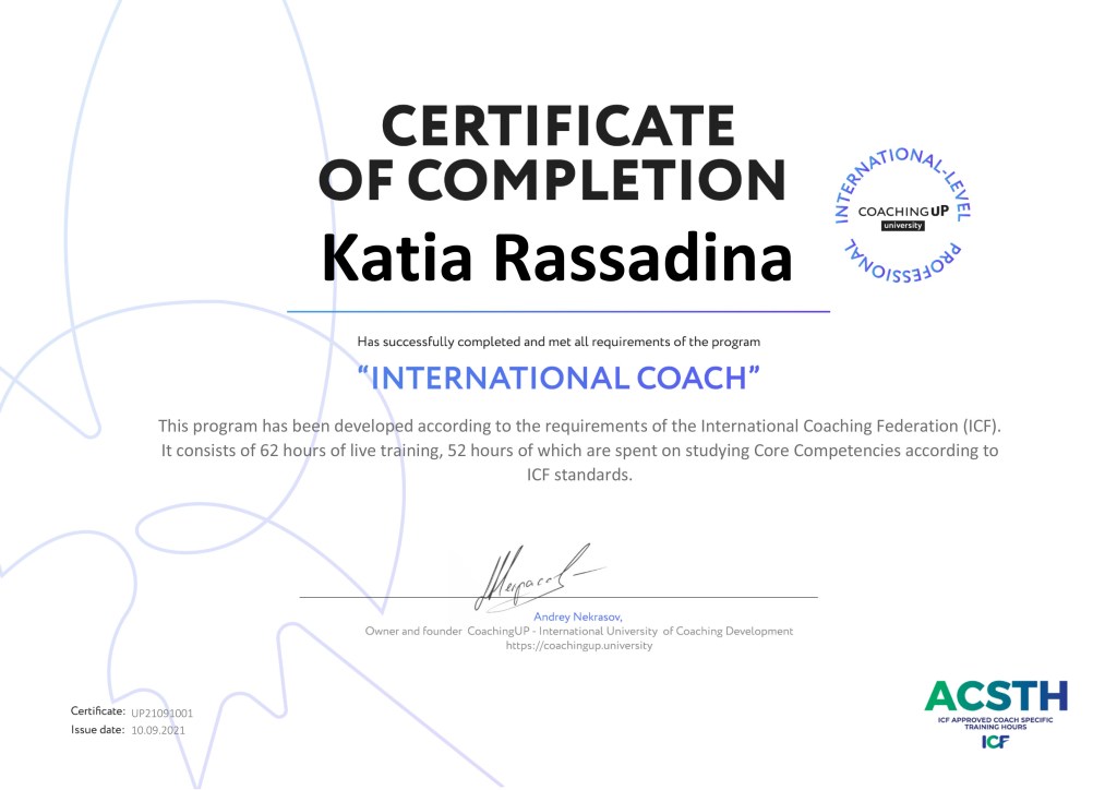 After 9 month of education in a program of a Professional Certified Coach I’ve finally graduated. The path was full of self-reflections, realization and changes. The self-exploration which I as a coach promote in my clients, starts with the self. I’ve studied 8 competencies and 37 markers of these competencies, which International Coaching Federation (ICF) is considering a must for a professional coach.